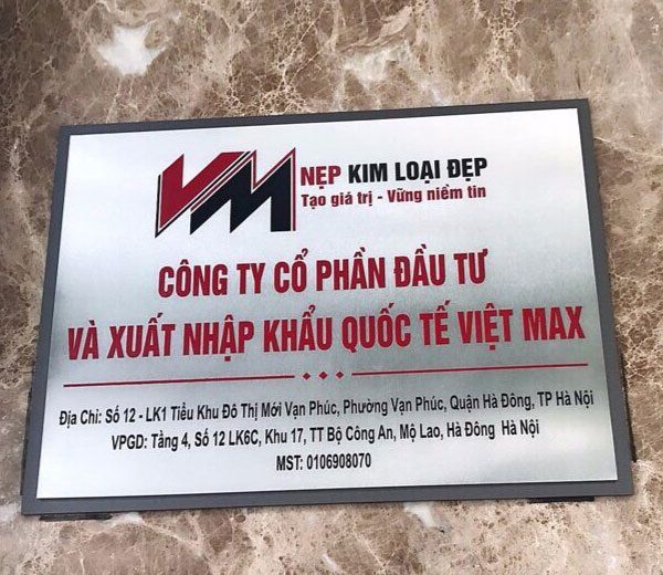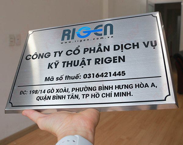Chất liệu inox, đồng có thời gian sản xuất hoàn thiện trung bình 2 ngày, sang trọng và độ bền rất cao là ưu điểm của sản phẩm này. Giá thành biển inox, đồng cao hơn mica, tuy nhiên với chi phí không quá cao cho một sản phẩm hiển thị bộ mặt của công ty, vì vậy giá thành ít khi ảnh hưởng đến lựa chọn chất liệu biển